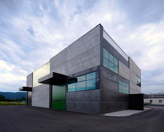 OFIS architecture just finished their most recent project, an office, store & shop in trata, skofja loka, slovenia. the structure is located in an industrial area next to other factories and offices. the client knew they wanted to work with a construction company that uses a prefabricated concrete building system, so the architects needed to work within this limitation. one of their main opportunities for experimentation was using the concrete system’s ready made openings on each elevation. the architects covered these openings with a variety of material including glass, metal and translucent polycorboante plates. these translucent plates were coloured to add more dimension to the facades. about 2/3 of the building is used for storage of the client’s products while the other area was divided between offices, loading areas, store and a classroom for lectures.from Designboom - Weblog Etiketter: office